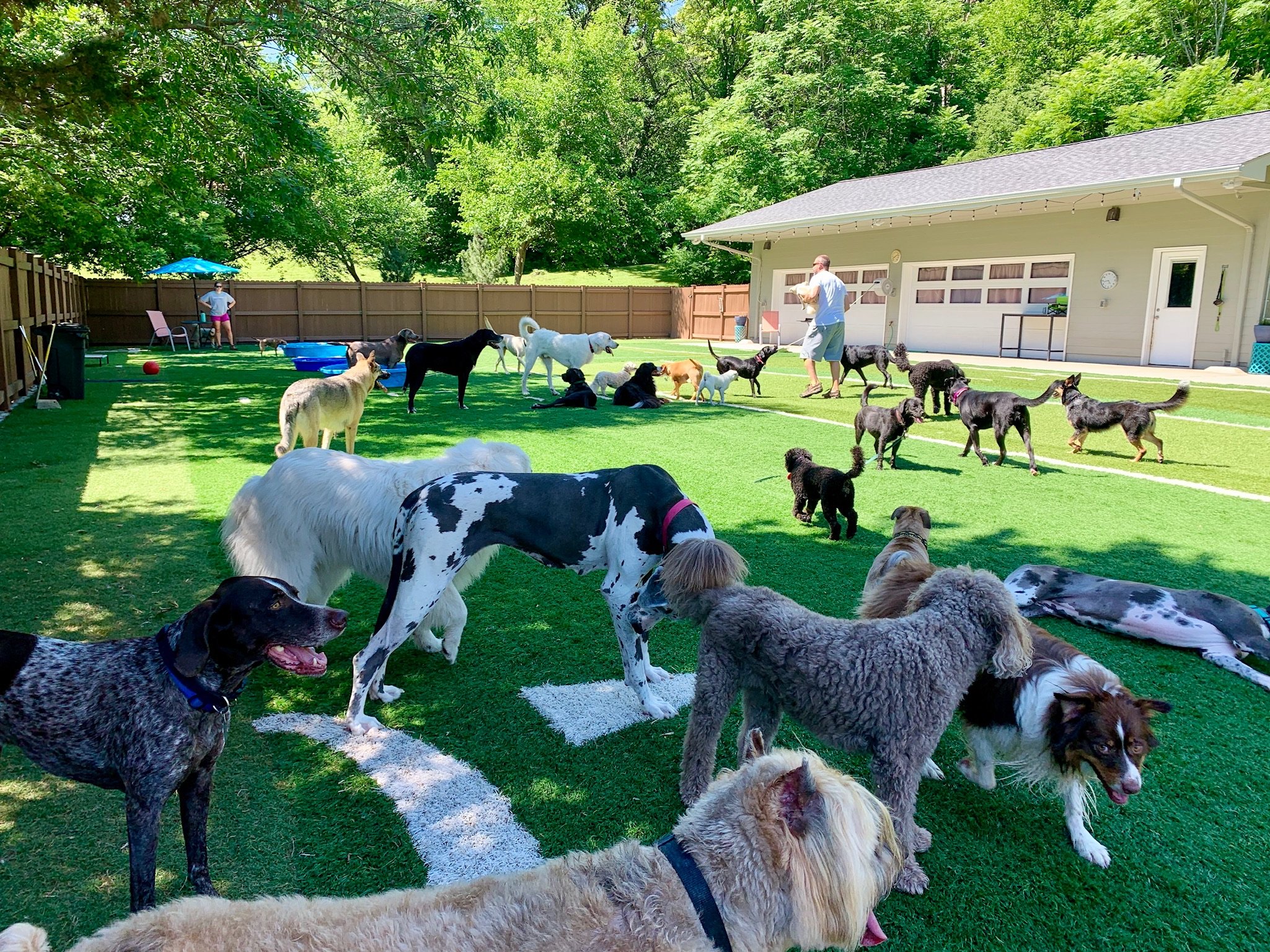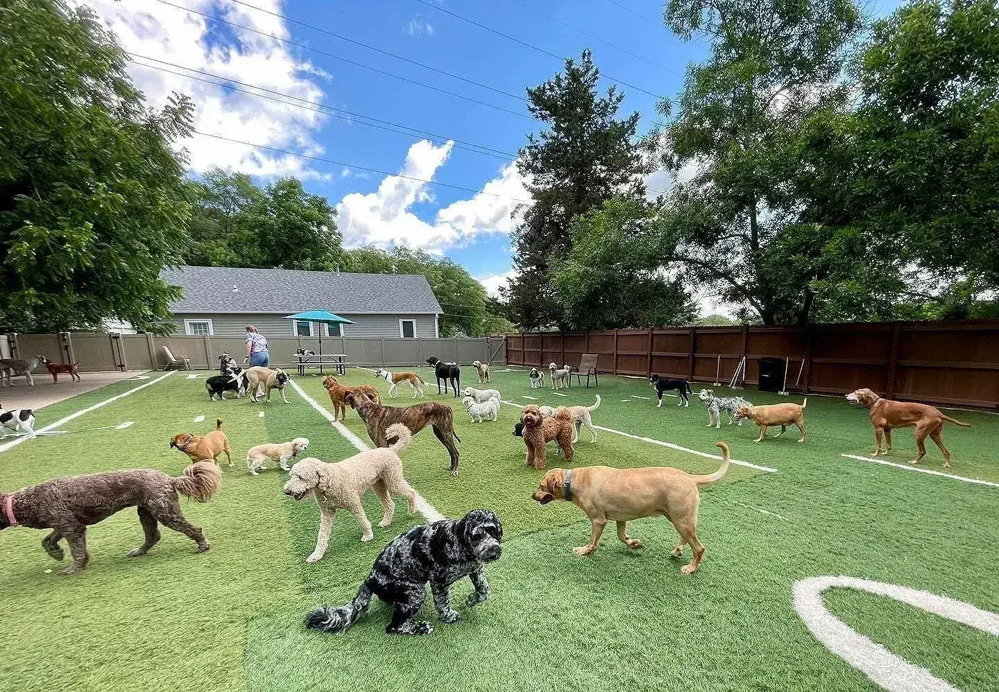 Morning starts with supervised group play in spacious yards designed for larger dogs. Playgroups are thoughtfully matched by size and energy level to keep things balanced and safe.